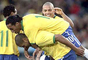 写真右上; 37分に2点目を決めたFWアドリアーノ ( ブラジル / 下 ) の背中に飛び乗るMFホナウジーニョ・ガウーショ。上の笑顔はFWホナウド、左に写る11番はMFゼ・ホベルト。