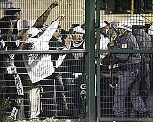 写真右上; ピッチに乱入したコリンチャーノの一人 ( 写真右 ) が、アデマール・ブラーガ監督 ( 写真左 ) に身振り手振りで抗議している。アデマール・ブラーガ監督の表情は困惑気味だ。 |