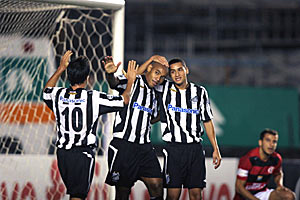 写真右上; 20分に2点目のゴールを決めたDFルイス・アウベルト ( サントス / 中央 ) は、FWホドリーゴ・チウイ ( 右 ) とMFホドリーゴ・タバタ ( 左 / 10番 ) の祝福を受ける。