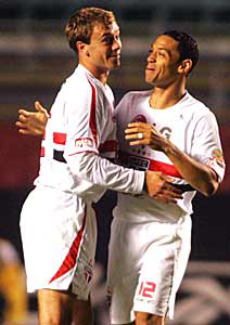 写真右上; DFディエーゴ・ルガーノの祝福に笑顔をみせるFWヒカルド・オリベイラ ( サンパウロ / 右 ) 。