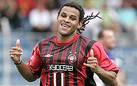 ブラジル全国選手権は、5月27〜28日に第8節が行われた。クリチーバのエスタジオ・アレーナ・ダ・バイシャーダで行われた アトレチコ・パラナエンセ×ジュベントゥージ は、FWオゼアス ( 元アルビレックス新潟 ) の弟であるFWデニス・マルケスが後半ロスタイムにゴールを決めてアトレチコ・パラナエンセが勝ち点3を獲得した。 試合は、立ち上がりを支配したアトレチコ・パラナエンセが相手陣内でボールをまわして得点の機会をうかがっていく。対するジュベントゥージは防戦一方ながら高い集中力で献身的に守った。後半、アトレチコ・パラナエンセはFWデニス・マルケスを投入して攻撃に厚みをかけるも、GKアンドレの好守に阻まれる。ジュベントゥージは、少ないチャンスからゴール前に攻め込むが、75分に訪れた決定機をものにできず、試合は 0-0 のまま進んでいった。そして迎えた後半ロスタイム、動かなかった試合が最後の最後で動いた。右サイドでフリーキックを得たアトレチコ・パラナエンセは、MFフェレイラがゴール前にクロス。これをDFパウロ・アンドレが頭で合わせたが、ボールは枠外に逸れていく。ところが、そのボールにFWデニス・マルケスが頭でボールの軌道を変えてゴールに押し込んだ。オフサイドぎりぎりの位置で待ちかまえていたFWデニス・マルケスの値千金の決勝ゴールでリードしたアトレチコ・パラナエンセが勝利。スタジアムに詰めかけた大勢のサポーターに勝ち点3を贈呈した。 アトレチコ・パラナエンセは、ホームで絶対に勝ち点が欲しかった試合であった。しかし、ジュベントゥージの堅い守備になかなかゴールを奪えず、攻めあぐねるシーンも目立った。そんな試合で勝利を得られたのは、ジバニウド・オリベイラ監督の采配に尽きる。2トップに限界を感じた同監督は、FWデニス・マルケスを投入を投入し、さらにDFダニーロに代えてMFファブリッシオを投入。4-4-2 から 3-5-2 に変更して先制点と勝利を真剣に狙っていった。その姿勢が、チームに好結果をもたらしたのだと思われる。次節は、好調クルゼイロとの対決を控える。彼らにとっての、前半の正念場はおそらくここになる。 対するジュベントゥージは、前半にDFハウレンが負傷し交代要員を出す不運にも見舞われた。これで切るカードが1枚減ったジュベントゥージは、流れを変えたい終盤に交代枠がひとつ足りず、試合の流れを最後まで自分たちに寄せることができなかった。 写真; 試合終了間際に値千金の決勝点を叩きだしたFWデニス・マルケス ( アトレチコ・パラナエンセ ) 。実の兄であるFWオゼアス ( 元アルビレックス新潟 ) に、かなり似ている。