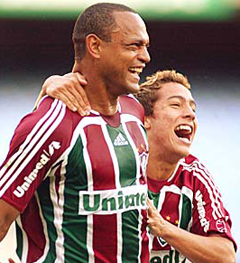 写真右上; 9分に豪快なダイビングヘッドでゴールネットを揺らし興奮冷めやらぬFWトゥッタ ( フルミネンセ / 左 ) は、相方のFWレニーとともに笑顔。