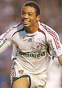 写真右上; 80分にダイビングヘッドでチーム3点目を決めたDFマルセーロ ( フルミネンセ ) は満面の笑みを浮かべる。