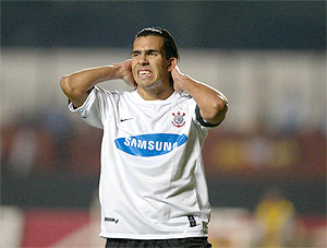写真右上; 痛恨の引き分けで勝ち点1しか取れず、試合結果に頭を抱えて顔をゆがめるFWカルロス・テベス ( コリンチャンス ) 。