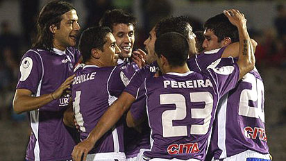 写真右上; 立ち上がりの5分に先制のPKを決めたMFアルバーロ・ナバーロ ( デフェンソール ) にチームメイトが集まって祝福。