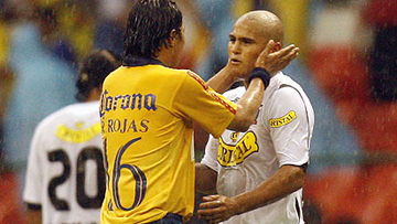コッパ・リベルタドーレスは、5月8〜10日に決勝トーナメント1回戦の 2nd.Leg が各地で行われた。チリは首都サンティアーゴのエスターディオ・で行われた コロ・コロ×クルブ・アメリカ は、終盤に点の取り合いをコロ・コロが 2-1 で制した。だが2試合合計 4-2 で勝ち抜けたのは、この日敗れたクルブ・アメリカだった。 試合は、序盤からコロ・コロが攻め立てる。DFビダルのシュートを初めコロ・コロは20分までに11本もシュートを打っていた。2分間で1本というハイペースでシュートを乱れ打ち。クルブ・アメリカのゴールを何度も脅かした。クルブ・アメリカもFWサンティアーゴ・フェルナンデスがゴール前でシュートを放つなど見せ場はつくったが、前半は 0-0 で終了する。 後半もコロ・コロは怒濤の攻めを展開。そして71分、右サイドからの折り返しをFWアレクシス・サンチェスがシュート。これはゴールポストを直撃したが、その跳ね返りがDFホセ・アントーニオ・カストロの身体に当たってゴールに転がり、コロ・コロがようやく先制に成功した。しかし、コロ・コロの猛攻は思うように追加点を生み出さず、度重なるピンチに耐えたクルブ・アメリカは87分に、FWサルバドール・カバーニャスのパスをMFカルロス・インファンテがミドルシュート。ボールはGKセーハスの左手をかすめてゴールネットに突き刺さった。これがクルブ・アメリカの勝ち上がりを意味する重要なアウェイゴールとなった。コロ・コロは89分にFWウンベルト・スアーソが右足で合わせて1点を追加したが、ゴールを決めたスアーソに笑顔はなく。クルブ・アメリカが敵地でベスト8を決めた。 グループリーグでは大陸を震撼させる快進撃を披露。競馬で言うところの"上がり馬"的な存在として一目置かれたコロ・コロだったが、前節の完敗が彼らの快進撃を阻むこととなった。3点差を追いかけて始まったこの試合ではひたすらFWウンベルト・スアーソにボールを集めて相手ゴールに迫ったが、ゴールが決まったのは71分のことだった。25本ものシュートを放ちながら2得点に留まった。せめて前半のうちに1点でも取ることができていれば、結果はもう少し違ったものになっていたかもしれない。 一方クルブ・アメリカは、攻め込まれてはいたが焦ることなく試合を乗り切った。仮に 0-2 で負けても何ら問題はなかったのだが、テーナ監督は先制を許しても守備固めには走らず、FWネルソン・クエーバスを投入するなど、自分たちのリズムが崩れることを避けた。この日は敗れたが、87分のMFインファンテのゴールで運命を決したクルブ・アメリカ。彼らの快進撃はまだ続きそうである。 写真; 試合後、DFリカルド・ロハス ( クルブ・アメリカ / 左 ) と言葉を交わすFWウンベルト・スアーソ ( 右 ) は悲しそうな表情。