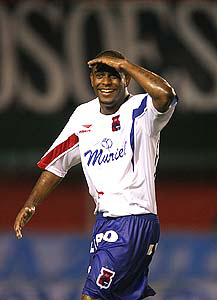写真右上; 前半ロスタイムに豪快なフリーキックを決めて満面の笑みを浮かべるFWジョエウソン ( パラナー ) 。