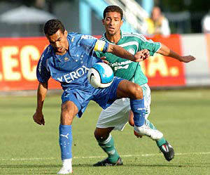 ブラジル全国選手権は6月2〜3日に第4節が行われた。サンパウロのエスタジオ・パルケ・アンタルチカで行われた パウメイラス× クルゼイロは、FWアラウージョ ( 元ガンバ大阪 ) の先制点を含め計3点を奪ったクルゼイロが敵地で勝ち点3を獲得した。 試合は、開始早々クルゼイロが先制。5分、右のスペースに流れたFWホニーがゴール前にグラウンダーのクロスを供給すると、逆サイドから走り込んだFWアラウージョが角度のないところから思いきり左足を振り抜き、ゴールネットの天井を揺らすシュートでチームに得点をもたらした。パウメイラスは34分にコーナーキックにMFマルチネスが頭で合わせて同点に追いつくが、クルゼイロはセットプレイから最後はMFラミレスがゴールに押し込み、1点リードで前半を折り返した。 後半、パウメイラスは前がかりに攻めて一時的に試合の流れを引き寄せたが、詰めが甘く同点の機会を逸すると、クルゼイロがカウンターからワンチャンスをものにした。86分、MFラミレス、MFパウリーニョ・ジーアスと中盤で素早くボールをつなぐと、MFレオナルド・シウバのスルーパスに反応したFWホニーがオフサイドぎりぎりで裏へ抜け出して独走。ペナルティエリアまで侵入したところでシュートをニアに決めてトドメを刺した。 開幕から2勝1分と好調なスタートを切ったはずのパウメイラスは、この試合でブラジレイロンでの今季初黒星をマーク。首位に浮上する絶好機を逃したことも考えると痛い敗戦であった。数日前にFWエジムンドがチーム批判をしたとの報道も流れたが、エジムンドは90分間出場。敗因はエジムンドではなく、FWオズマールとMFホルヘ・バルディビアの不在による展開力の低下にあった。冷静に守る相手を揺さぶりきれなかったのも致し方ない。 一方3試合を終えて未勝利だったクルゼイロにとって、敵地であげた初勝利には大きな意味がある。ホームで3点を奪いながら逆転負けを喫した精神的ダメージは少なからずあったとドリーバウ・ジュニーオール監督は語っているが、試合に臨んだ選手たちは気持ちを切り替えていた。アラウージョは試合後、「立ち上がりにゴールを決めたことで流れをつかんだ。チームの勝利に貢献できてよかった」とコメントしている。 写真; 開始5分に先制ゴールを決めたFWアラウージョ ( クルゼイロ / 手前 ) 。後方にいるのはMFピエーヒ ( パウメイラス ) 。